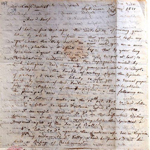 From 1821 to 1835, the North American Agency was based at the VEC in Rome. Under this arrangement, successive Rectors of the VEC acted as agents of the American Catholic hierarchy, serving as “middle men” between them and the various departments of the papal Curia in Rome. The so-called North American Agency Papers within the VEC Archives include 135 letters relating to affairs in Baltimore (1821-1834), the first diocese of the United States, and, for many years, its most influential. There are also 23 letters (1829-1835) relating to the then recently established diocese of Philadelphia.